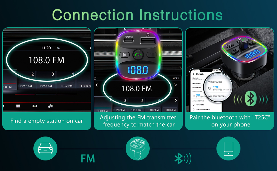 (2) LED display lights up and shows: 13.5-bt-107.6 (3) Bluetooth connection: After initial sequence is displayed, the device is ready to pair with voice prompt: "Waiting for connection." Results for bluetooth fm transmiter for car "bluetooth fm transmitter for car" in Cell Phone Accessories.Search all categories instead This item: LENCENT FM Transmitter Car Bluetooth Adapter, Wireless Radio Music Adapter Car Kit with 2 USB Charging, Audio Receiver Car Charger MP3 Player, LED Display Hands-Free Calling Support U Disk & TF Card